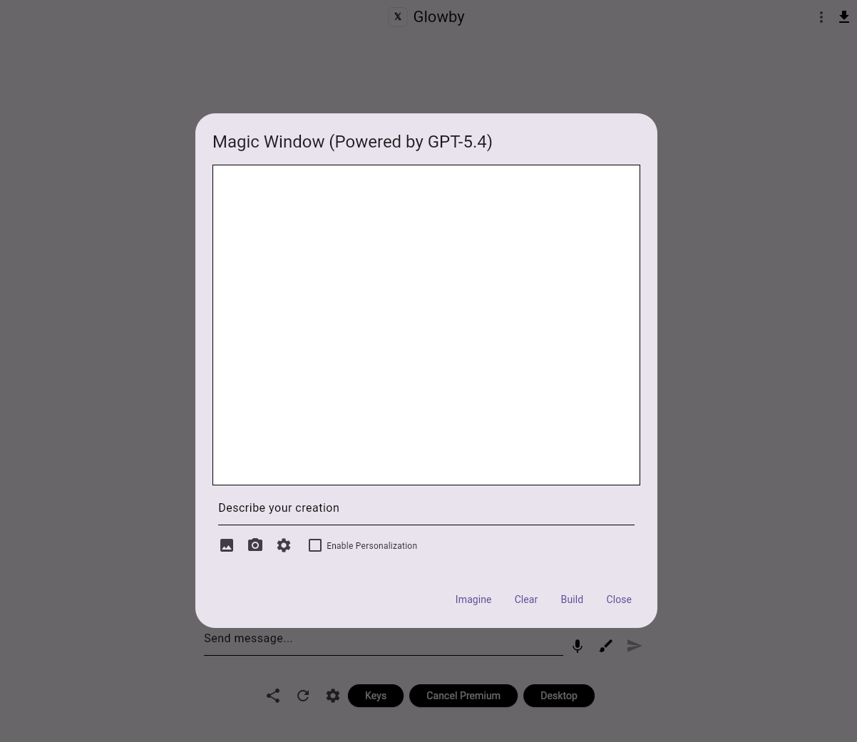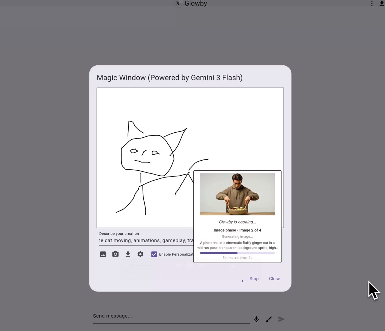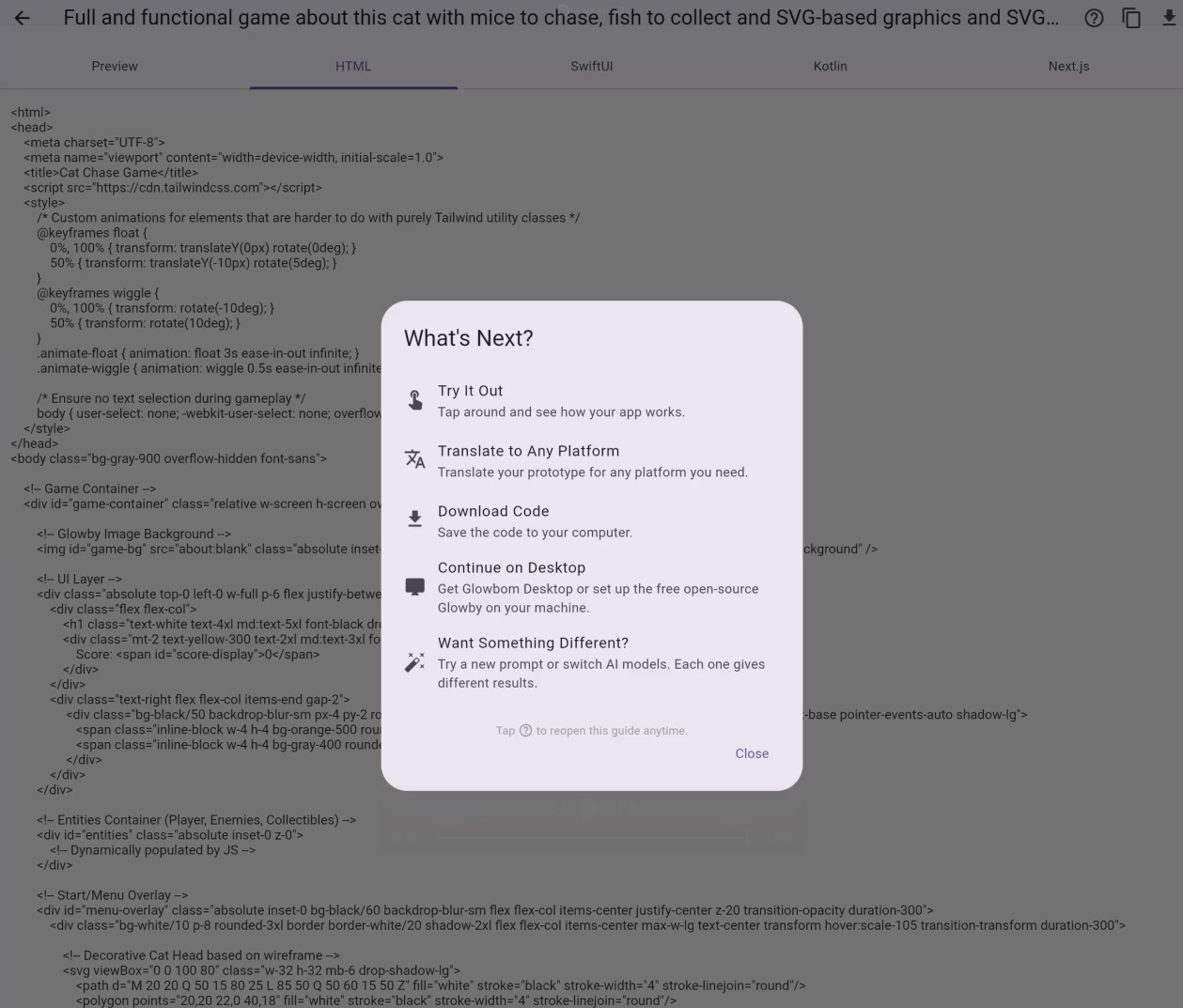 When it is done, you get a working prototype you can play with right in the browser. Glowby generates the images, the code, and the whole idea for you.
