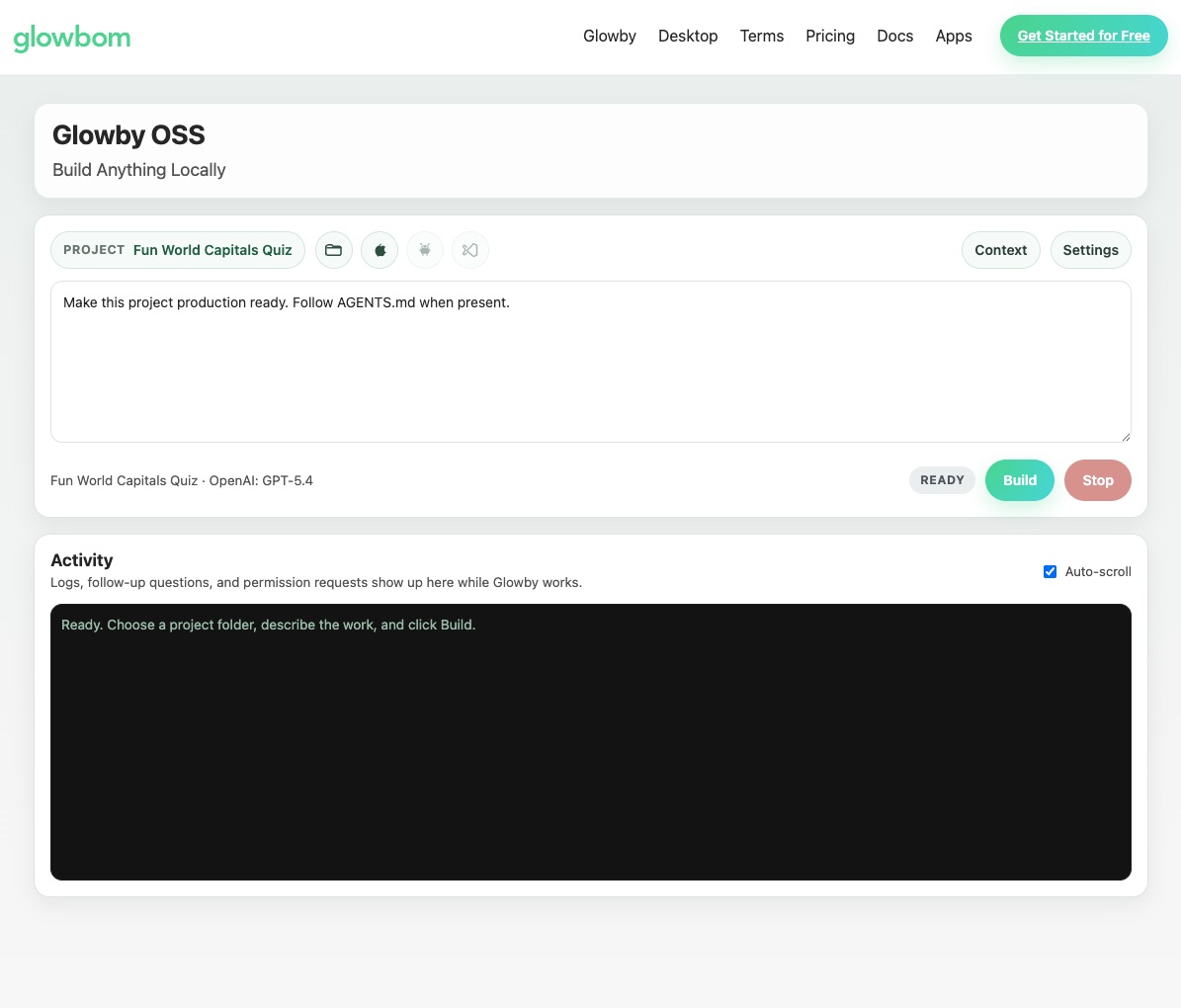 Use Glowby OSS to take your Glowbom project and make it production ready with AI coding agents, all running on your machine.